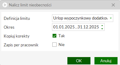 - Domyślnie ustawiony jest checkbox „Kopiuj korekty”, dzięki któremu zostanie skopiowane pole Korekta, jeżeli wcześniej było uzupełnione na poprzednio naliczonym limicie urlopu wypoczynkowego dodatkowego