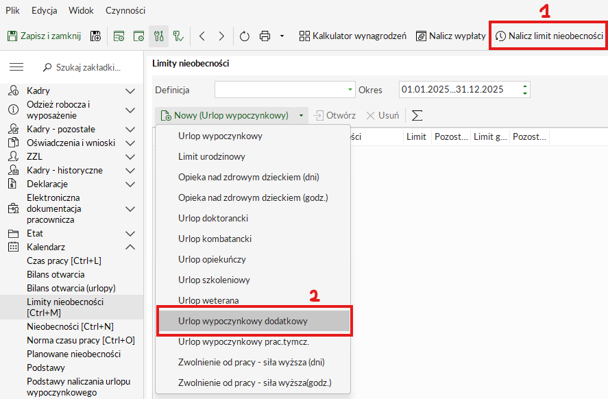 - Metoda 1: Za pomocą przycisku „Nalicz limit nieobecności” (zalecany) – oznaczony na zrzucie powyżej cyfrą „1”.