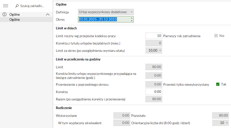 - W oknie parametrów wybieramy Definicję limitu „Urlop wypoczynkowy dodatkowy”