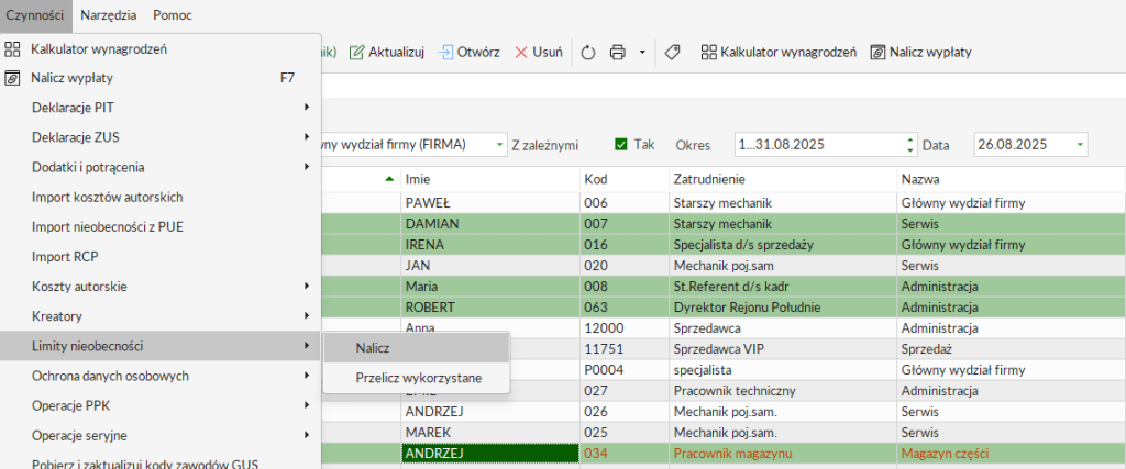 - Po ich zaznaczeniu przejść do górnego Menu i wybierz: Czynności->Limity nieobecności->Nalicz