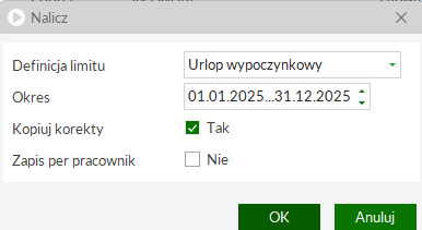 - Domyślnie ustawiony jest checkbox „Kopiuj korekty”, dzięki któremu zostanie skopiowane pole Korekta, jeżeli wcześniej było uzupełnione na poprzednio naliczonym limicie urlopu wypoczynkowego