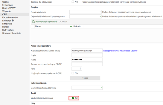 W sekcji „Taski”, zaznacz pole „Wyświetlaj przypominacz”.