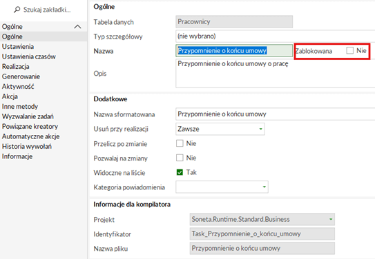 Znajdź zadanie „Przypomnienie o końcu umowy”. Otwórz zadanie i odznacz  pole  „Zablokowana” (ma być niezablokowana)