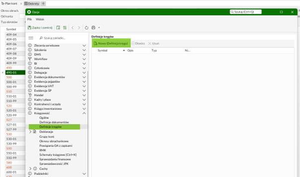 - Wejdź do opcji programu enova365: Narzędzia -> Opcje -> Księgowość -> Definicje kręgów. Wybierz Nowy (Definicja kręgu)