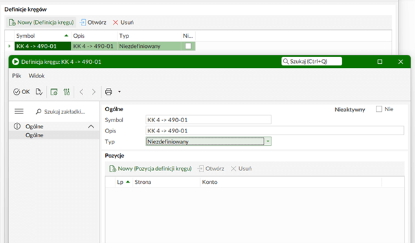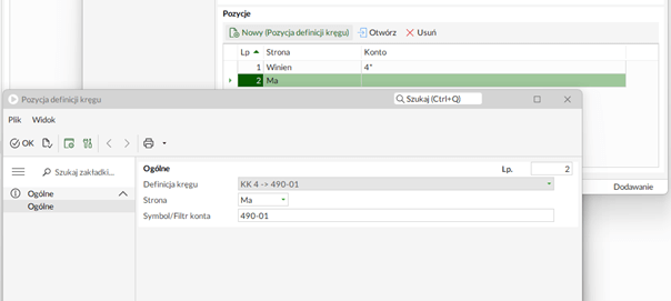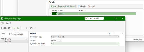 - Następnie wybierając Nowy (Pozycja definicji kręgu) dodaj pozycje definicji kręgu dla strony Winien