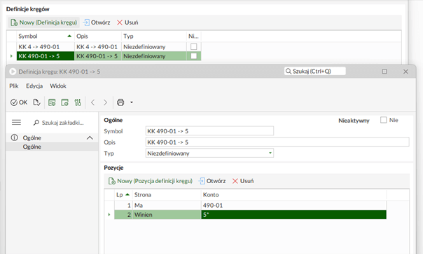 Załóżmy, że jednostka prowadzi plan kont w układzie rodzajowym i funkcjonalnym z kontem rozliczenia 490-01. Przygotujemy definicję kręgu weryfikującą zgodność sum zapisów na kontach 4* -> 490-01 oraz 490-01 -> 5*