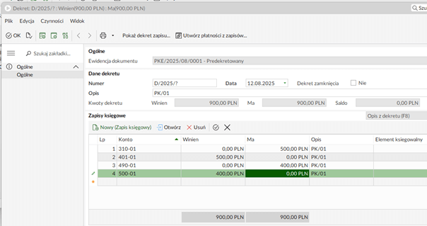 Pomimo, że dekret bilansuje się system enova365 nie pozwala na zapisanie go