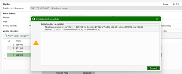 Zdefiniowane w powyższy sposób kręgi kosztów gwarantują, że sumy zapisów księgowych na konta układu 4 i 490-01 oraz układu 5 i 490-01 będą zgodne. W przypadku braku zgodności użytkownikowi w momencie zapisywania dekretu pojawi się odpowiedni komunikat.